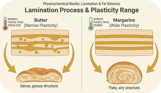 Butter has a relatively narrow plasticity range and tends to “oil out” at ambient factory temperatures during lamination processes, such as those used for croissants or puff pastry.