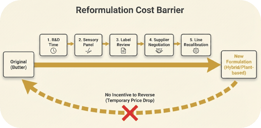- First, reformulation has a cost: R&D time, sensory panel validation, label review, supplier negotiation, and line recalibration. Once absorbed, there is little incentive to absorb it again simply because one input commodity temporarily cheapened.