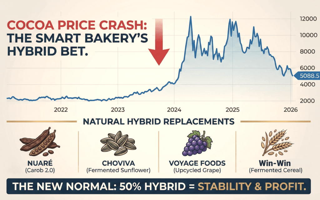 Cocoa futures have plummeted to a near 2-year low, but don’t cancel your R&D projects yet. While the charts show relief, the supply chain remains structurally broken. Smart manufacturers aren’t celebrating the dip; they are using it to lock in permanent hybrid strategies like Nuaré to escape the volatility loop forever.