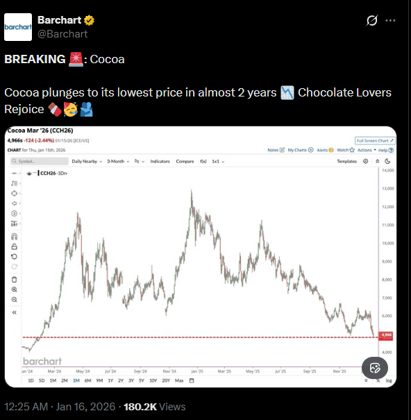 As of January 2026, cocoa futures have largely erased the parabolic gains of the last 18 months, dropping significantly from their all-time highs.