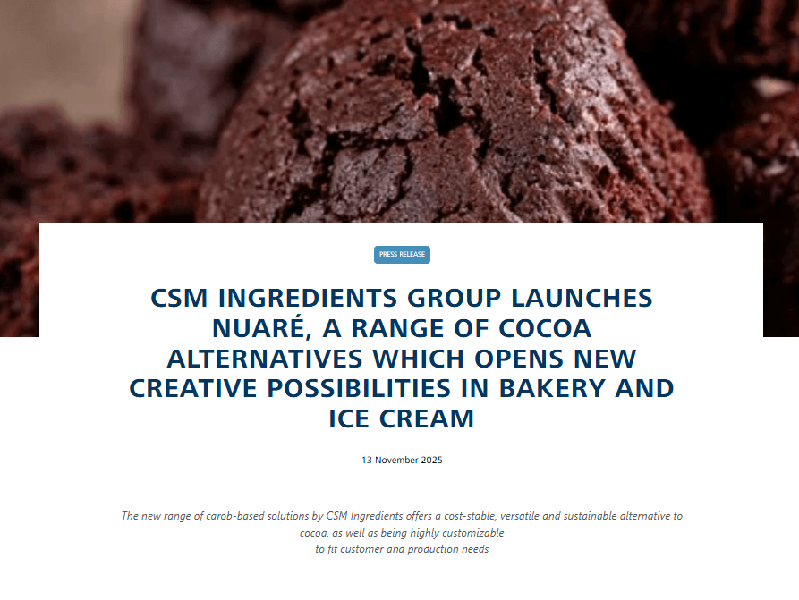 - CSM Ingredients launches Nuaré, Baking & Biscuit International: https://bakingbiscuit.com/csm-ingredients-launches-cocoa-alternative-range/