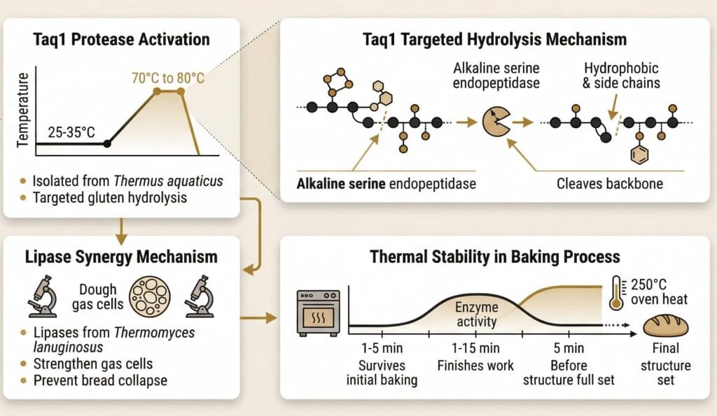 Standard enzymes fail as ovens heat up, leading to limited bread volume. New Taq1 proteases activate only at high temperatures, allowing for perfect gluten relaxation during expansion; this replaces chemical additives while maximizing the “short bite” texture in industrial production.