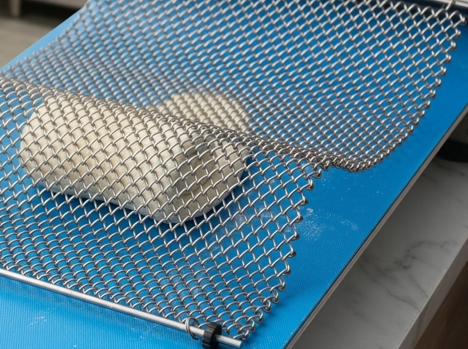Curling is the step where the dough sheet, after being stretched by the rollers, is transformed into a cylinder. A heavy metal mesh or curling chain exerts friction on the leading edge of the dough, forcing it to roll onto itself.