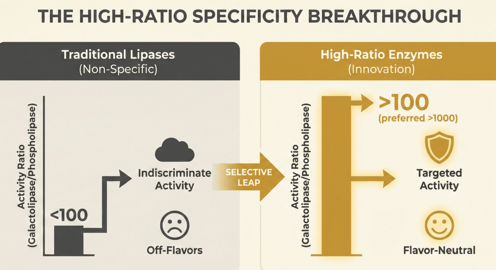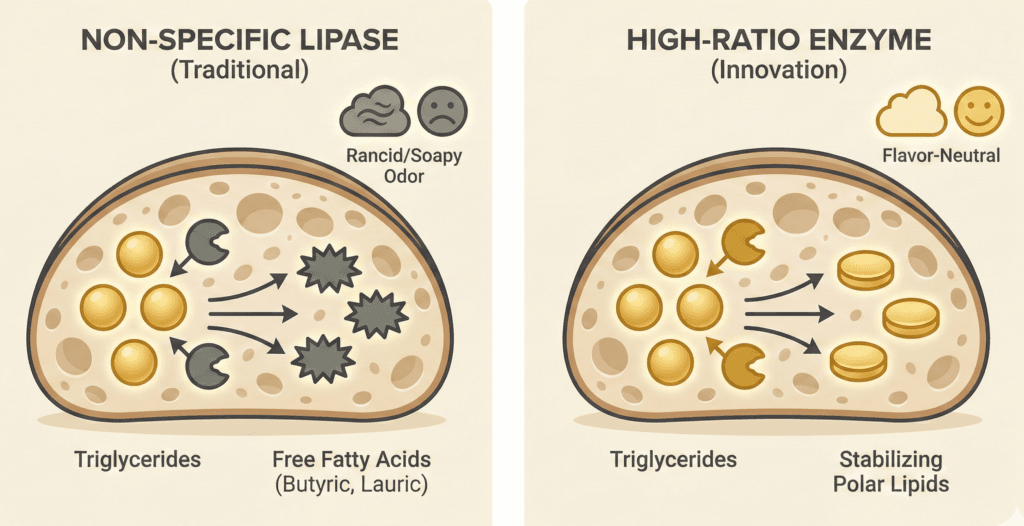 The historical barrier to widespread lipase use has always been sensory deterioration, specifically hydrolytic rancidity. First and second-generation lipases were often too “promiscuous”, attacking triglycerides indiscriminately.
