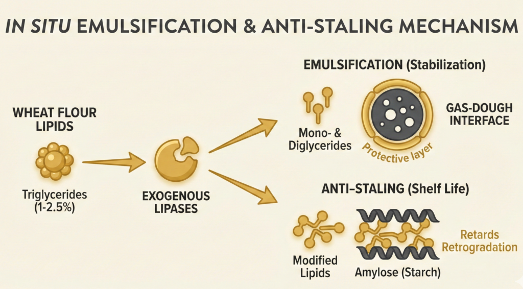 • Emulsification: The hydrolysis converts triglycerides into mono- and diglycerides. These byproducts act as natural surfactants, stabilizing the gas-dough interface.