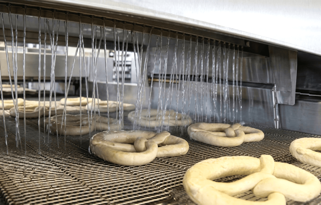 When dough is briefly submerged in a diluted lye solution before baking, the high alkalinity alters the surface chemistry.