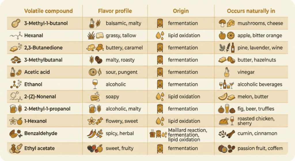 - Alcohols and Esters: Ethanol is the primary alcohol produced, but secondary alcohols and esters contribute fruity and solvent-like notes.