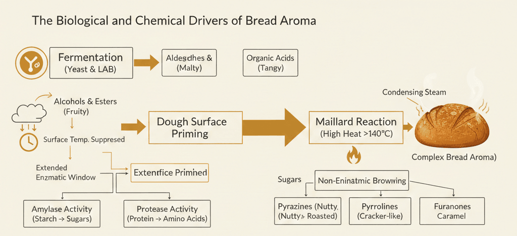 During fermentation, yeast cells and lactic acid bacteria (particularly in sourdoughs) metabolize sugars and generate a vast array of volatile organic compounds (VOCs). These compounds are responsible for the crumb’s internal aroma.