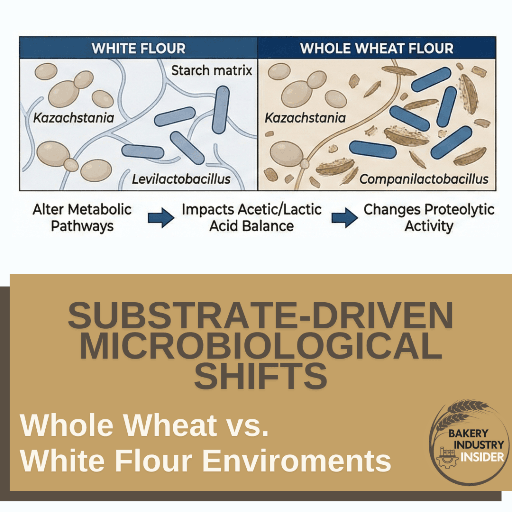 - The Shift: White flour environments typically support Levilactobacillus, whereas whole wheat substrates significantly favor the proliferation of Companilactobacillus.