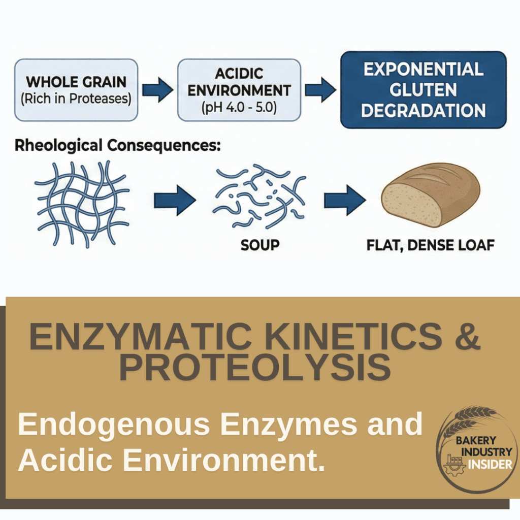 - The Compound Effect: Protease activity increases in acidic environments (pH 4.0 – 5.0). By combining the higher acidity required to overcome the buffering effect with this native protease load, gluten degradation accelerates exponentially.