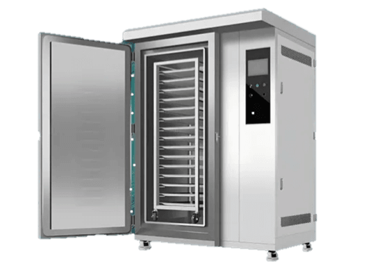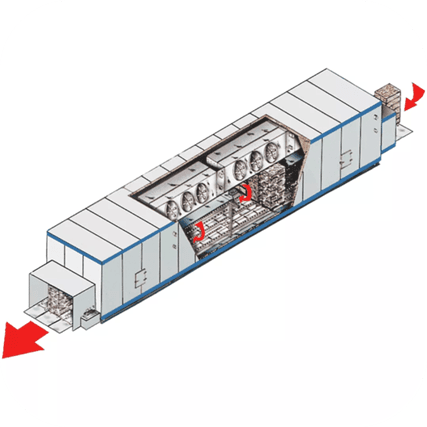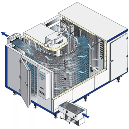 These feature an insulated chamber where air is blown horizontally across the products at high velocities of 3 to 6 m/s. They are incredibly flexible for different product sizes; however, they require significant floor space and could result in minor product weight loss due to dehydration.