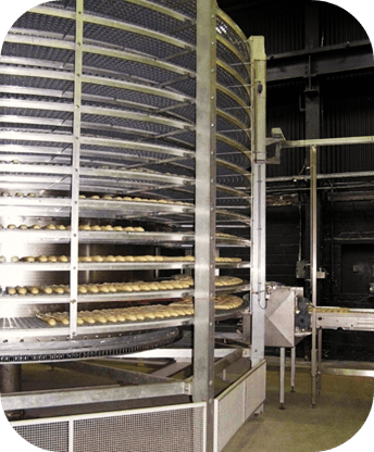 Spiral freezers wind around a cylindrical core to save valuable floor space. They are ideal for delicate or sticky products, allowing for a continuous, gentle transport that could freeze over 5 tons per hour.
