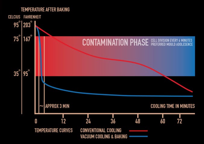 Vacuum cooling interacts directly with the physical and biochemical transitions of baked goods.